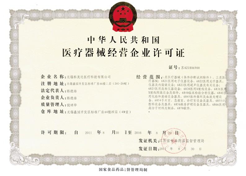 無錫科美達(dá)醫(yī)療器械有限公司于2011年8月順利取得中華人民共和國(guó)醫(yī)療器械企業(yè)經(jīng)營(yíng)許證。